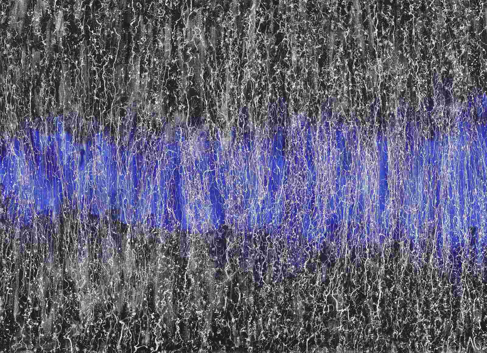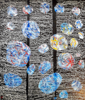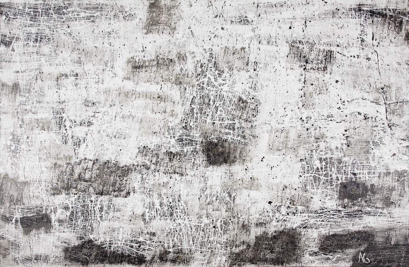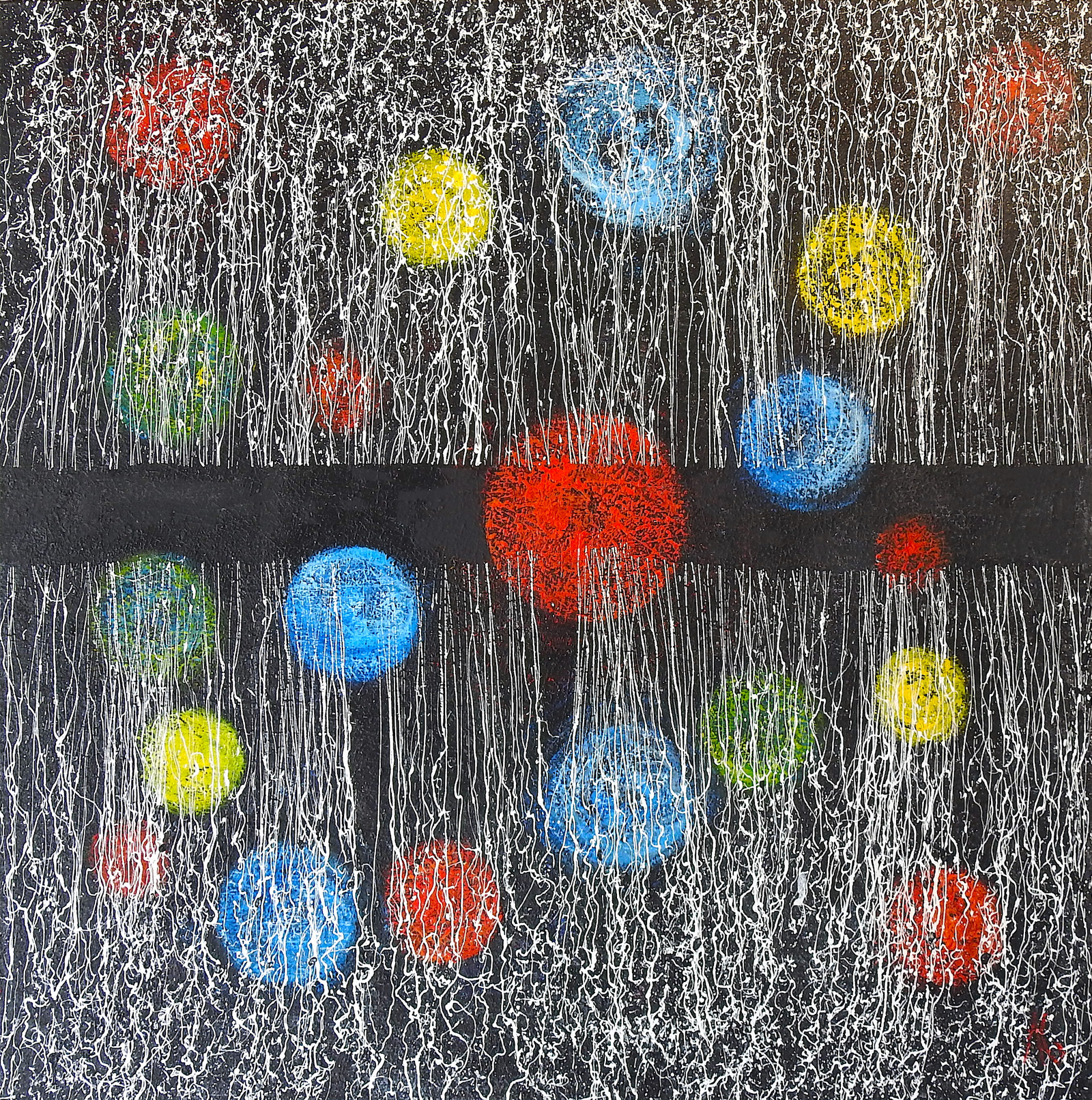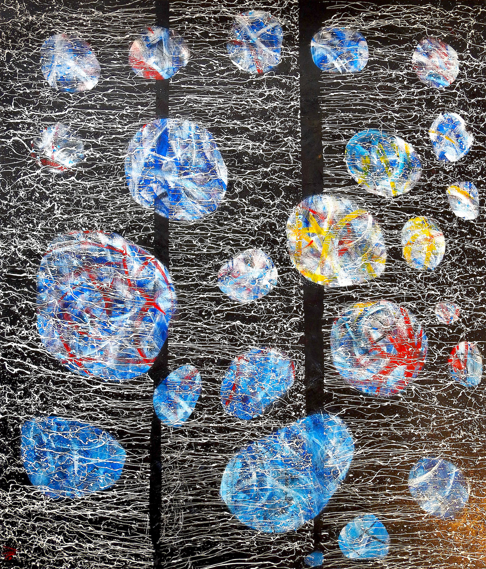 Symmetry is not rarely dominant in the paintings by Ana Guberina, and this symmetry is made alive in a particular manner by the rhythm; it is brought into resonance with the ever-changing world. Textures of the lines, created by means of forcefully thrown colour, are interlaced traces of dynamic gesture: it is a kind of action painting, a combination of exhilaration and sedateness, dispersiveness and straightforwardness, instinct and intellect; here, the flying quality of lines is interwoven, these line entwine pictorial micro-fragments thus creating dynamic structures of various morphologies and broad expressive registers, from burning and bright colours to refined chromatic reductions. Vehemently thrown colours, mostly achromatic, have spurted over the canvass creating a rich variety of trajectories, with their starting point connected. These trajectories are of tense linearity, of flexible sinusoid undulation, of spiral vortex-like quality, with their flying and interwoven features visible. The observer's attention is caught in grid-like fabrics of this unique dynamic gesture.