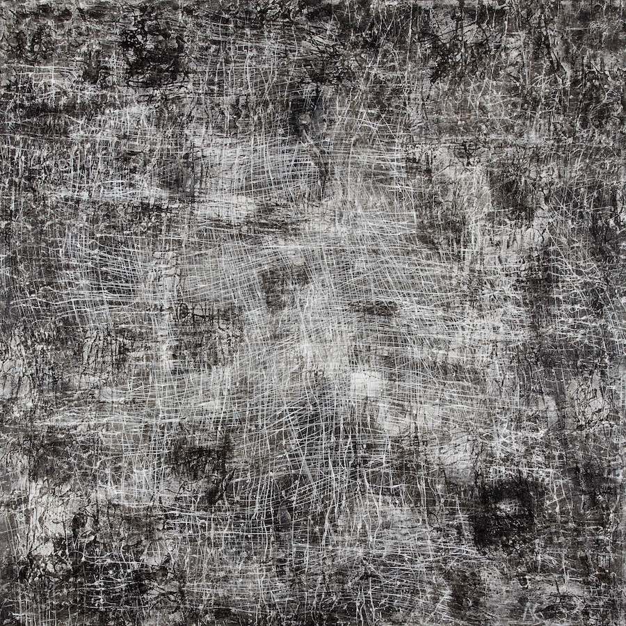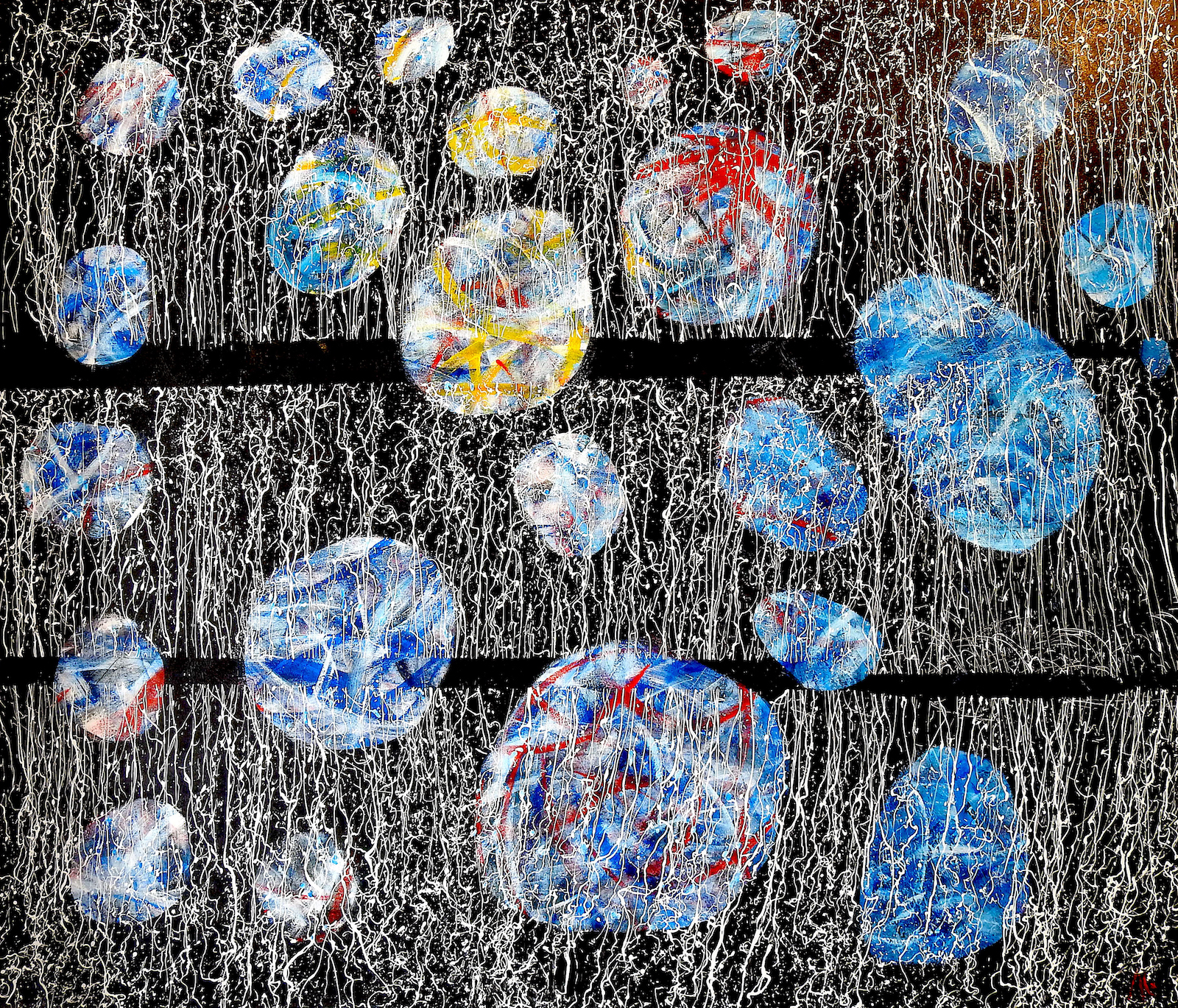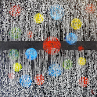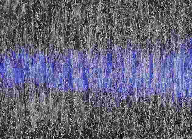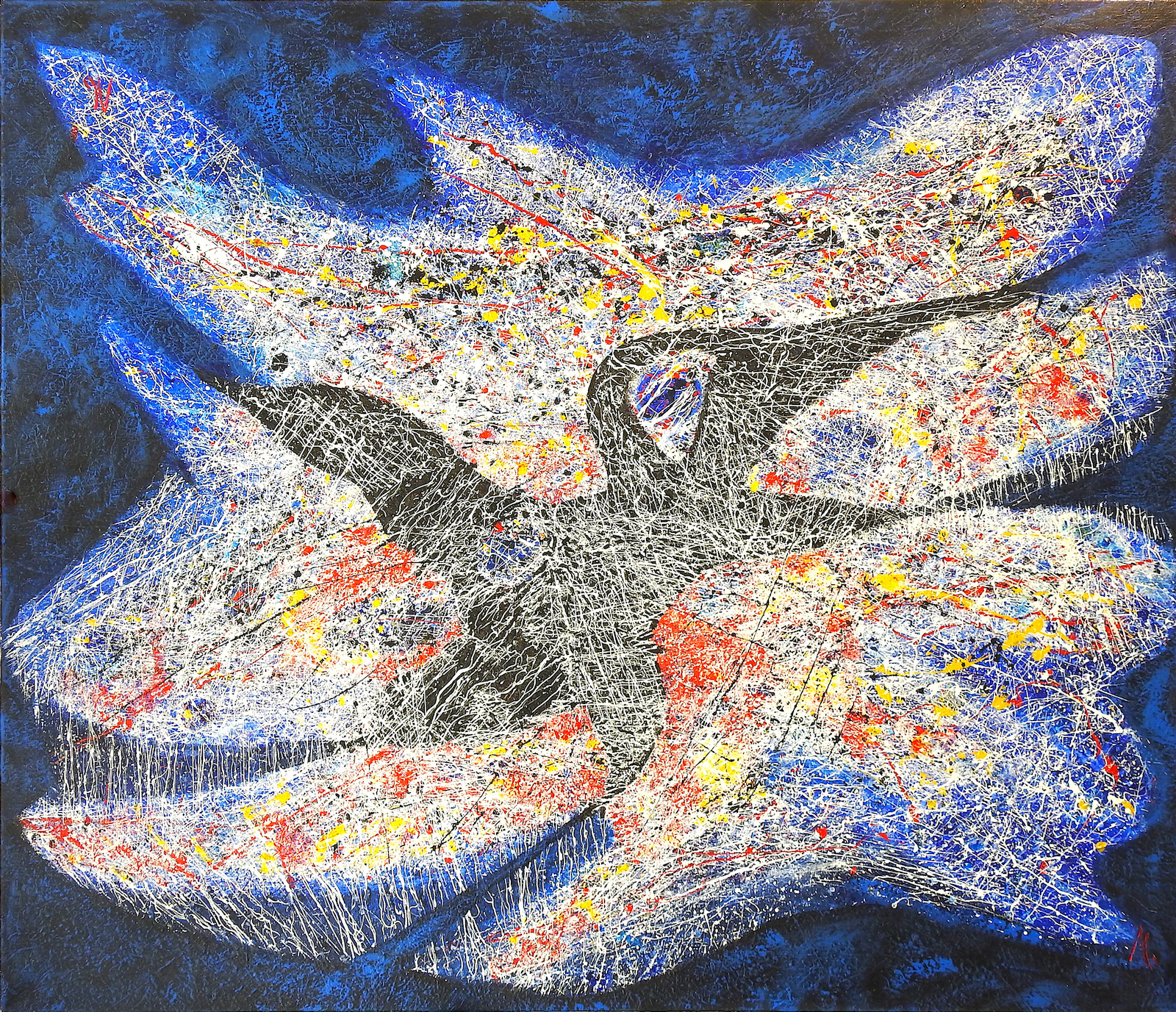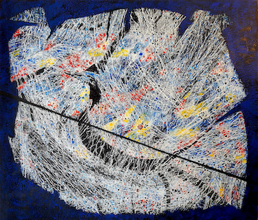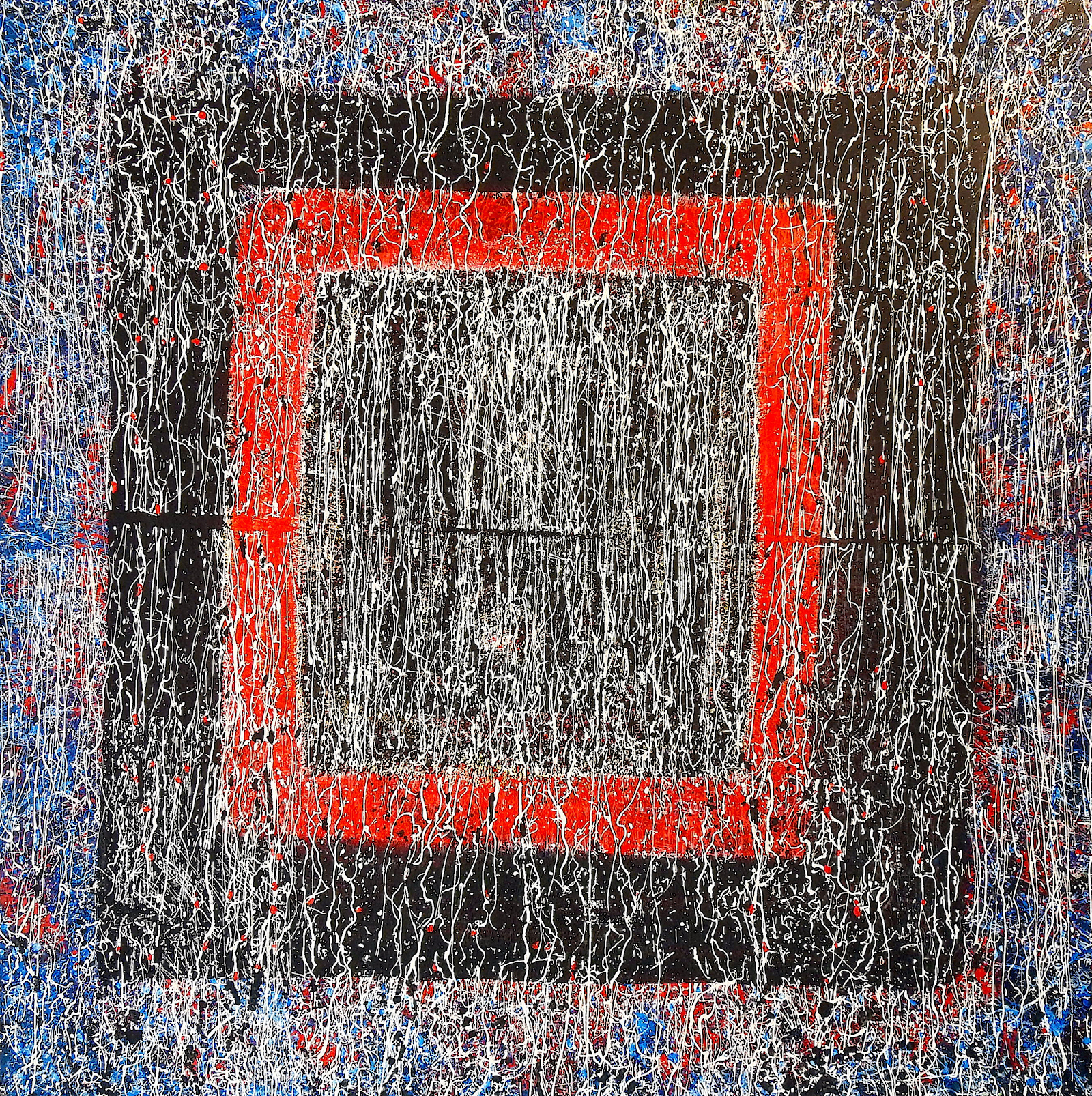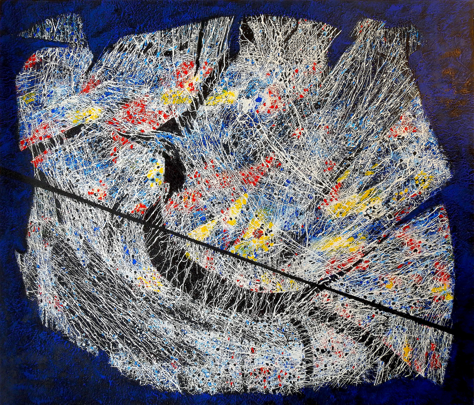 Symmetry is not rarely dominant in the paintings by Ana Guberina, and this symmetry is made alive in a particular manner by the rhythm; it is brought into resonance with the ever-changing world. Textures of the lines, created by means of forcefully thrown colour, are interlaced traces of dynamic gesture: it is a kind of action painting, a combination of exhilaration and sedateness, dispersiveness and straightforwardness, instinct and intellect; here, the flying quality of lines is interwoven, these line entwine pictorial micro-fragments thus creating dynamic structures of various morphologies and broad expressive registers, from burning and bright colours to refined chromatic reductions. Vehemently thrown colours, mostly achromatic, have spurted over the canvass creating a rich variety of trajectories, with their starting point connected. These trajectories are of tense linearity, of flexible sinusoid undulation, of spiral vortex-like quality, with their flying and interwoven features visible. The observer's attention is caught in grid-like fabrics of this unique dynamic gesture.