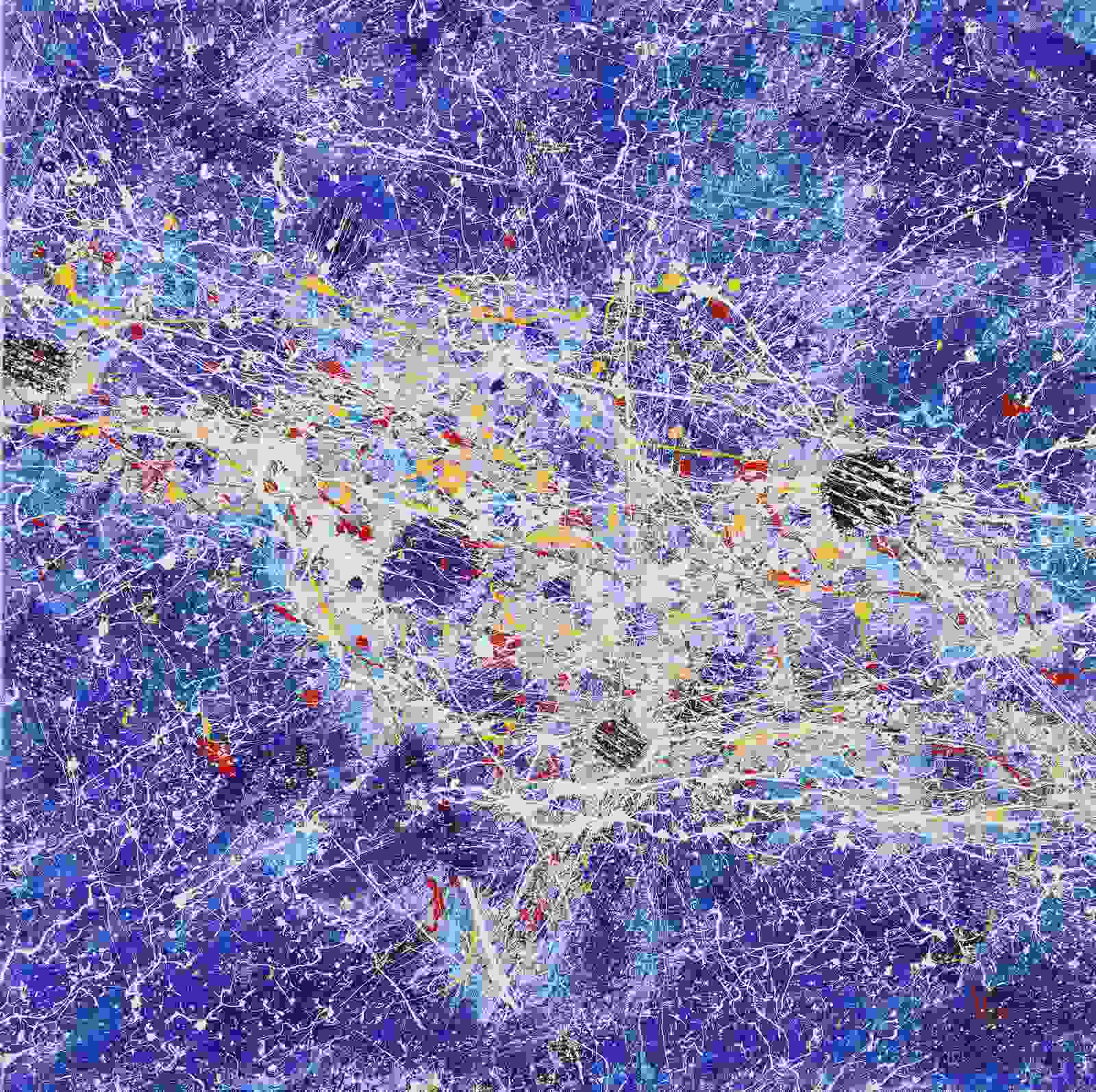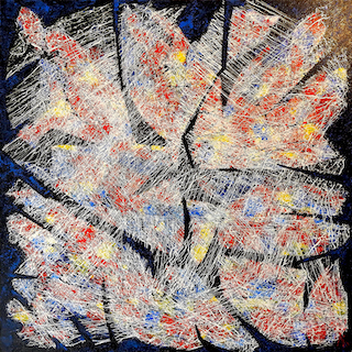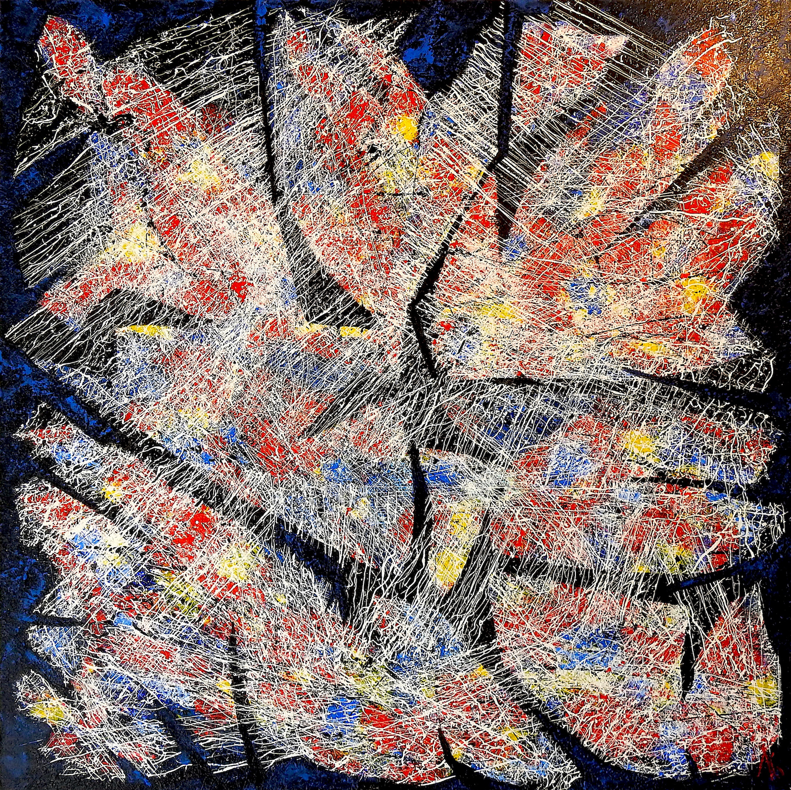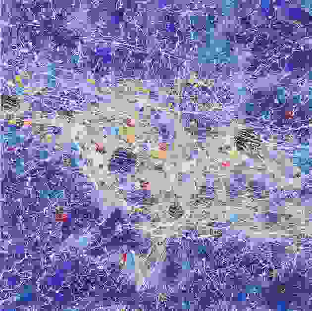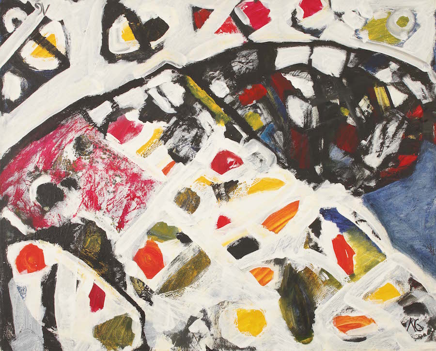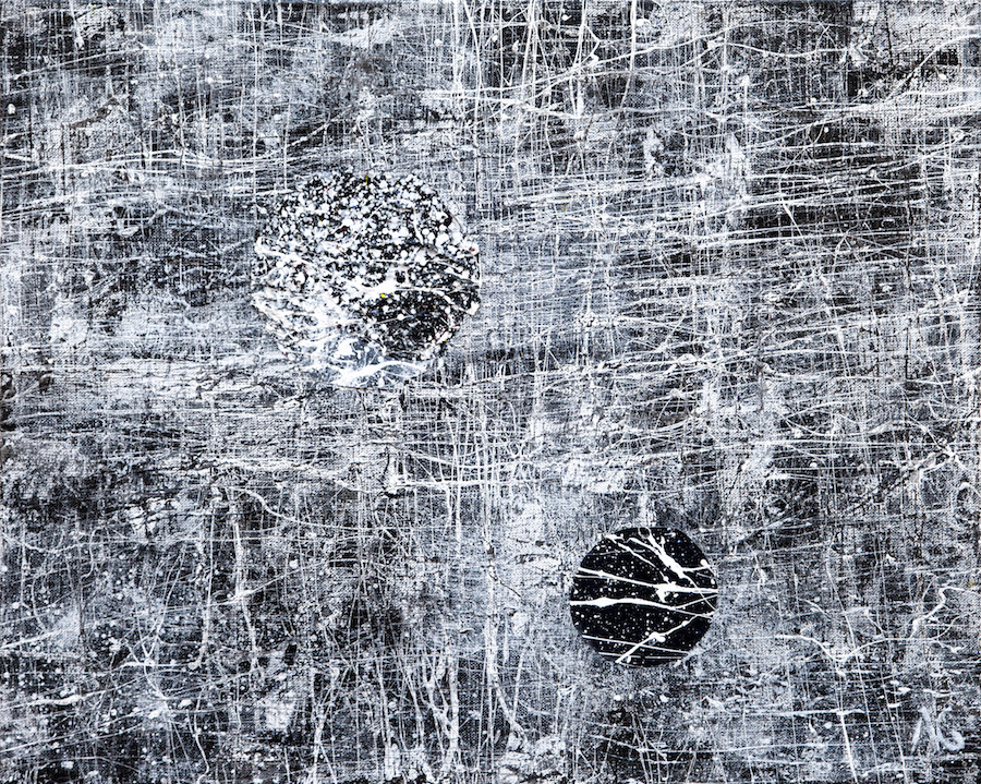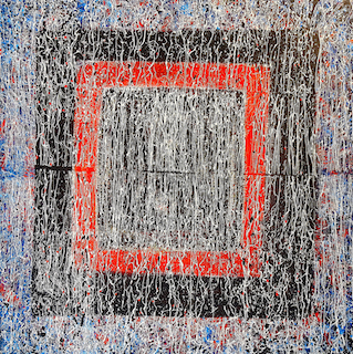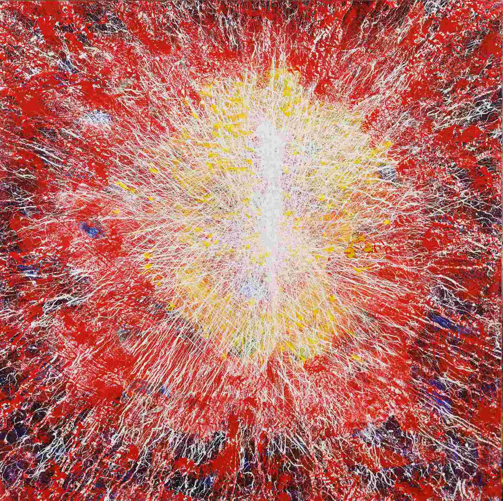 Symmetry is not rarely dominant in the paintings by Ana Guberina, and this symmetry is made alive in a particular manner by the rhythm; it is brought into resonance with the ever-changing world. Textures of the lines, created by means of forcefully thrown colour, are interlaced traces of dynamic gesture: it is a kind of action painting, a combination of exhilaration and sedateness, dispersiveness and straightforwardness, instinct and intellect; here, the flying quality of lines is interwoven, these line entwine pictorial micro-fragments thus creating dynamic structures of various morphologies and broad expressive registers, from burning and bright colours to refined chromatic reductions. Vehemently thrown colours, mostly achromatic, have spurted over the canvass creating a rich variety of trajectories, with their starting point connected. These trajectories are of tense linearity, of flexible sinusoid undulation, of spiral vortex-like quality, with their flying and interwoven features visible. The observer's attention is caught in grid-like fabrics of this unique dynamic gesture.