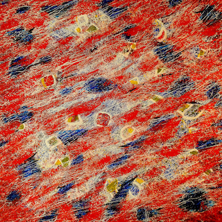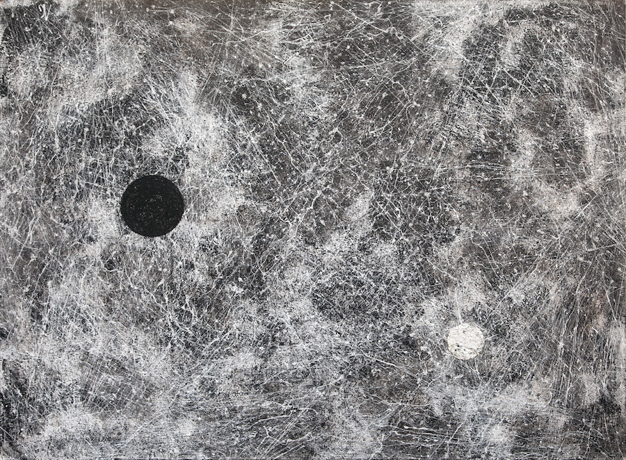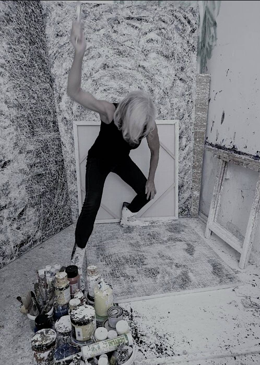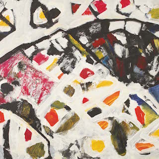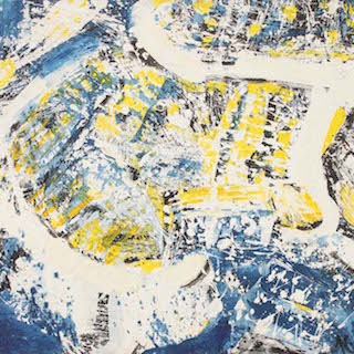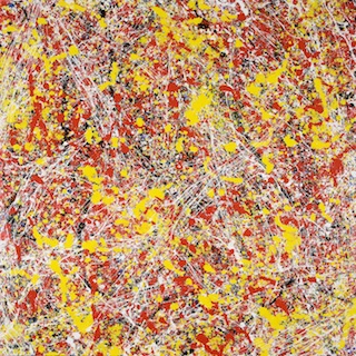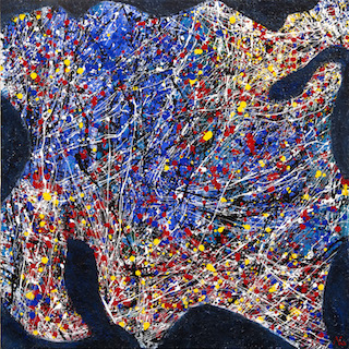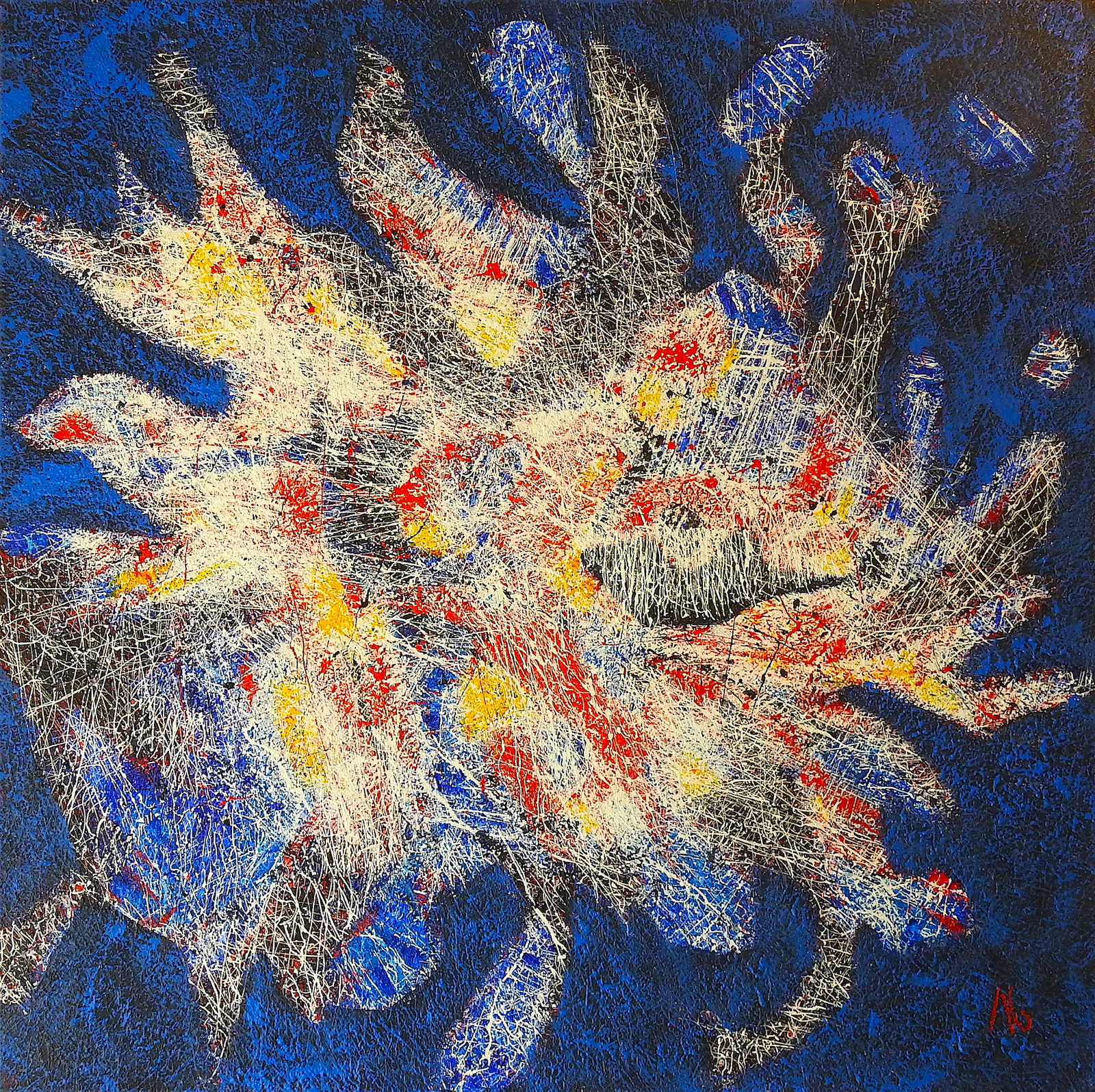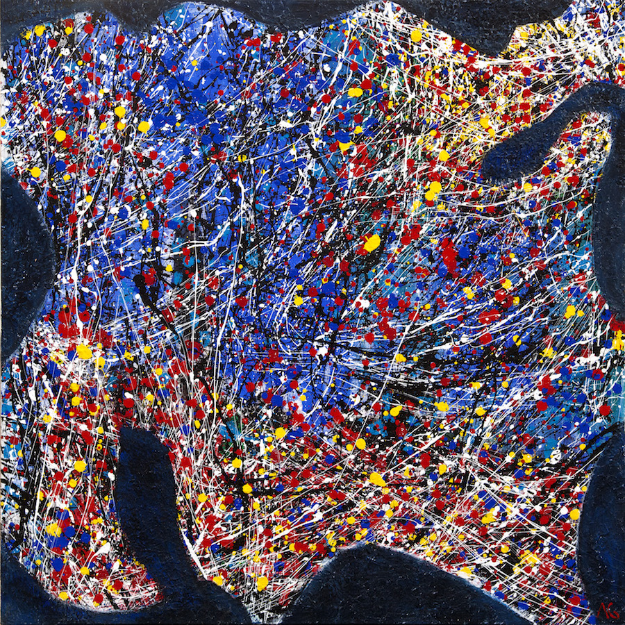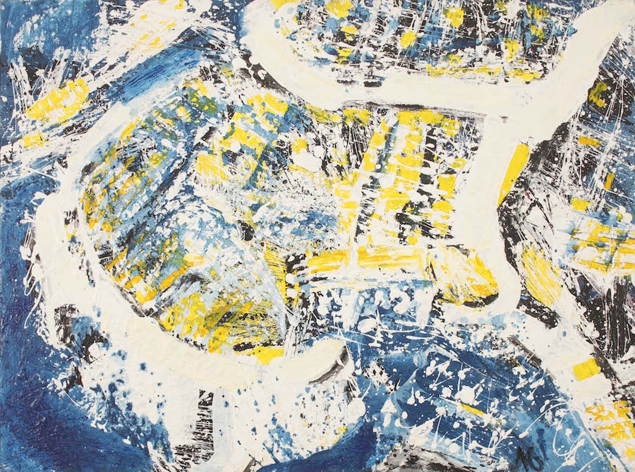 Symmetry is not rarely dominant in the paintings by Ana Guberina, and this symmetry is made alive in a particular manner by the rhythm; it is brought into resonance with the ever-changing world. Textures of the lines, created by means of forcefully thrown colour, are interlaced traces of dynamic gesture: it is a kind of action painting, a combination of exhilaration and sedateness, dispersiveness and straightforwardness, instinct and intellect; here, the flying quality of lines is interwoven, these line entwine pictorial micro-fragments thus creating dynamic structures of various morphologies and broad expressive registers, from burning and bright colours to refined chromatic reductions. Vehemently thrown colours, mostly achromatic, have spurted over the canvass creating a rich variety of trajectories, with their starting point connected. These trajectories are of tense linearity, of flexible sinusoid undulation, of spiral vortex-like quality, with their flying and interwoven features visible. The observer's attention is caught in grid-like fabrics of this unique dynamic gesture.